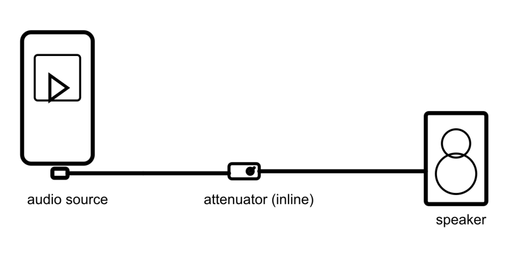 I started using a little gadget called an attenuator — a small box that sits between the audio source (in my case, my phone via a lightning-to-audio adapter) and a speaker with a 3.5mm headphone jack (not so common these days!).