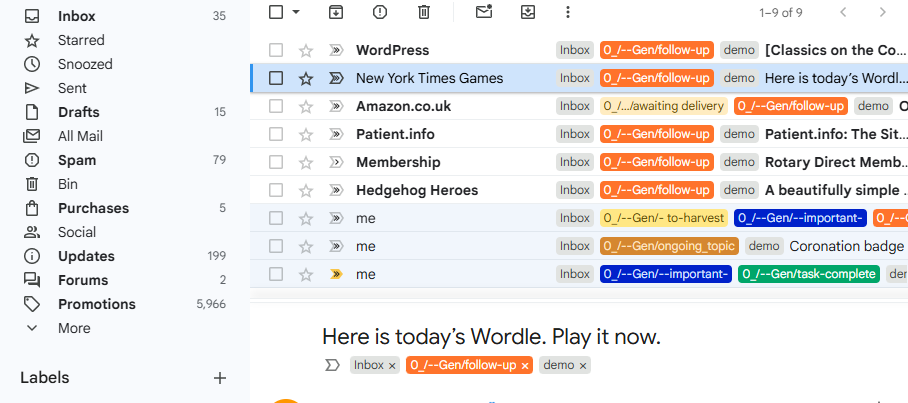 The screenshot below shows a simplified selection from my own inbox. Sharp-eyed readers will notice that my real-world labels don’t yet fully match the tidy scheme above. That’s deliberate honesty. My existing setup grew over time and became unwieldy, and I’m in the process of simplifying it. I may tell the full, nerdy back-story another day.